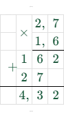 Первое число: $2,7 \cdot 1,6 = 4,32$.