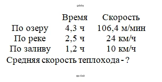 1.8. Экскурсионный теплоход двигался 4,3 ч по озеру со скоростью 106,4 м/мин, затем 2,5 ч по реке со скоростью 24 км/ч, наконец, 1,2 ч по заливу со скоростью 10 км/ч. Найдите среднюю скорость движения теплохода на всём пути.