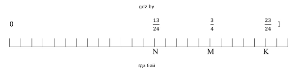 Ответ: Координату точки N можно найти, вычтя из координаты M($\frac{3}{4}$) длину отрезка MN ($\frac{5}{24}$). Координату точки K можно найти, прибавив к полученной координате N длину отрезка NK ($\frac{5}{12}$).