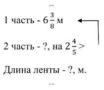 По условию, длина первой части составляет $6\frac{3}{8}$ м, а вторая часть на $2\frac{4}{5}$ м короче. Чтобы найти длину второй части, выполним вычитание: