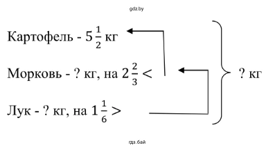 2. Найдем массу репчатого лука. По условию, его на $1\frac{1}{6}$ кг больше, чем моркови. Масса моркови, как мы выяснили, равна $2\frac{5}{6}$ кг. Чтобы найти массу лука, сложим массу моркови и $1\frac{1}{6}$ кг.