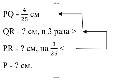 По условию, длина стороны $PQ$ составляет $\frac{4}{25}$ см. Сторона $QR$ в 3 раза больше стороны $PQ$. Чтобы найти ее длину, умножим длину $PQ$ на 3: