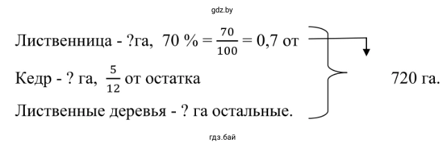 2.358. На участке сибирского леса 70 % занимает лиственница, 512оставшейся площади занимает кедр, а остальную площадь — лиственные деревья. Сколько гектаров занимают лиственные деревья, если площадь всего участка 720 га?
