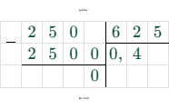 4. Последнее действие (деление): $2,5 : 6,25$. Перенесем запятые на два знака вправо: $250 : 625$. Сократим дробь $\frac{250}{625}$ на 125: $\frac{250:125}{625:125} = \frac{2}{5} = 0,4$.