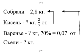 2.403. Из 27 собранных ягод чёрной смородины сварили кисель, из 70 % — варенье, а оставшиеся ягоды съели. Сколько килограммов ягод съели, если всего собрали 2,8 кг ягод?