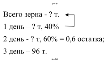 Во второй день было отгружено 60% остатка, после чего осталось 96 т. Следовательно, эти 96 т составляют $100\% - 60\% = 40\%$ от того количества зерна, которое было в колонне в начале второго дня. Пусть $y$ — это количество зерна в начале второго дня. Тогда: