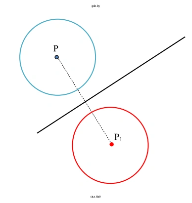 - Построим точку $O$, которая будет центром новой окружности. Точка $O$ должна быть симметрична точке $P$ относительно прямой $k$. Для этого: