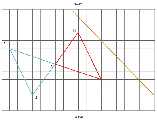 Соединив полученные точки $A'(7, 9)$, $B'(4, 7)$ и $C'(8, 5)$, получим искомый треугольник $A'B'C'$, симметричный треугольнику $ABC$ относительно прямой $n$.