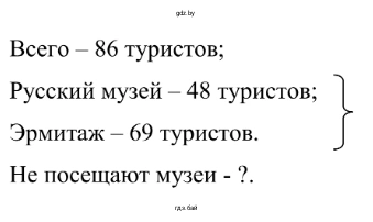 3.91. В Санкт–Петербург приехали 86 туристов. Русский музей хотят посетить 48 туристов, Эрмитаж — 69 и оба музея хотят посетить 36 туристов. Сколько человек не собираются посещать эти музеи?