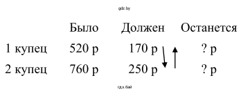 Итоговая сумма у первого купца: $520 - 170 + 250 = 350 + 250 = 600$ рублей.
