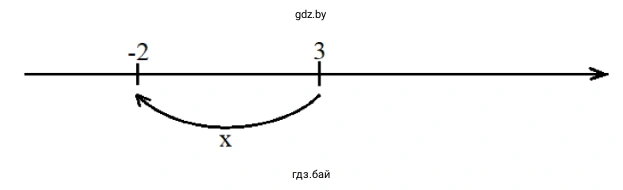 в) В уравнении $3 + x = -2$ мы начинаем движение из точки $3$ и, сместившись на $x$ единиц, попадаем в точку $-2$. Чтобы из точки $3$ попасть в точку $-2$, необходимо двигаться влево. Величина смещения равна разности конечной и начальной координат: $x = -2 - 3 = -5$. Движение влево на 5 единиц соответствует прибавлению отрицательного числа -5. Таким образом, $x=-5$.