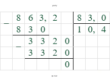 3. Выполним деление: $8,632 : 0,83$. Умножим делимое и делитель на 100: $863,2 : 83$.