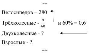 2) В магазине было 280 велосипедов. Трёхколёсные велосипеды составляли 940 всех велосипедов и 60 % числа двухколёсных велосипедов для детей. Остальные велосипеды были для взрослых. Сколько велосипедов было для взрослых?