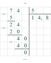 3. Деление: $-74 : 5 = -14,8$.