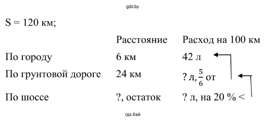 4.397. Автобус отправился от автовокзала, расположенного в центре города, в посёлок. Длина его маршрута составила 120 км. Из них 6 км он двигался по городу, 24 км – по грунтовой дороге, а остальное расстояние – по шоссе. Расход бензина на каждые 100 км составляет: по городу – 42 л, по грунтовой дороге – 56 от расхода по городу, а по шоссе – на 20 % меньше, чем по грунтовой дороге. Сколько литров бензина израсходовал автобус на путь туда и обратно?