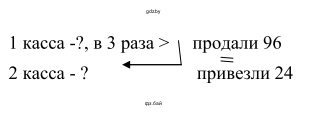 Пусть х билетов – было во второй кассе первоначально, тогда 3х билетов – было в первой кассе первоначально, (3х – 96) билетов – стало в первой кассе, (х + 24) билета – стало во второй кассе. Зная, что билетов в кассах стало поровну, составим и решим уравнение: