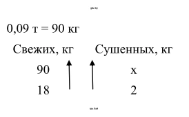 $90 \text{ кг свежих} \quad — \quad y \text{ кг сушёных}$