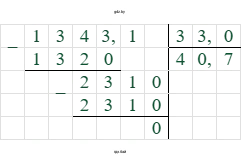 $134,31 : 3,3 = 1343,1 : 33 = 40,7$