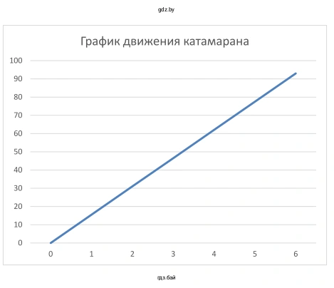 Ответ: График движения катамарана — это луч, выходящий из начала координат и проходящий через точки $(1, 15.5)$, $(2, 31)$, $(4, 62)$ и $(6, 93)$, как показано на рисунке выше.